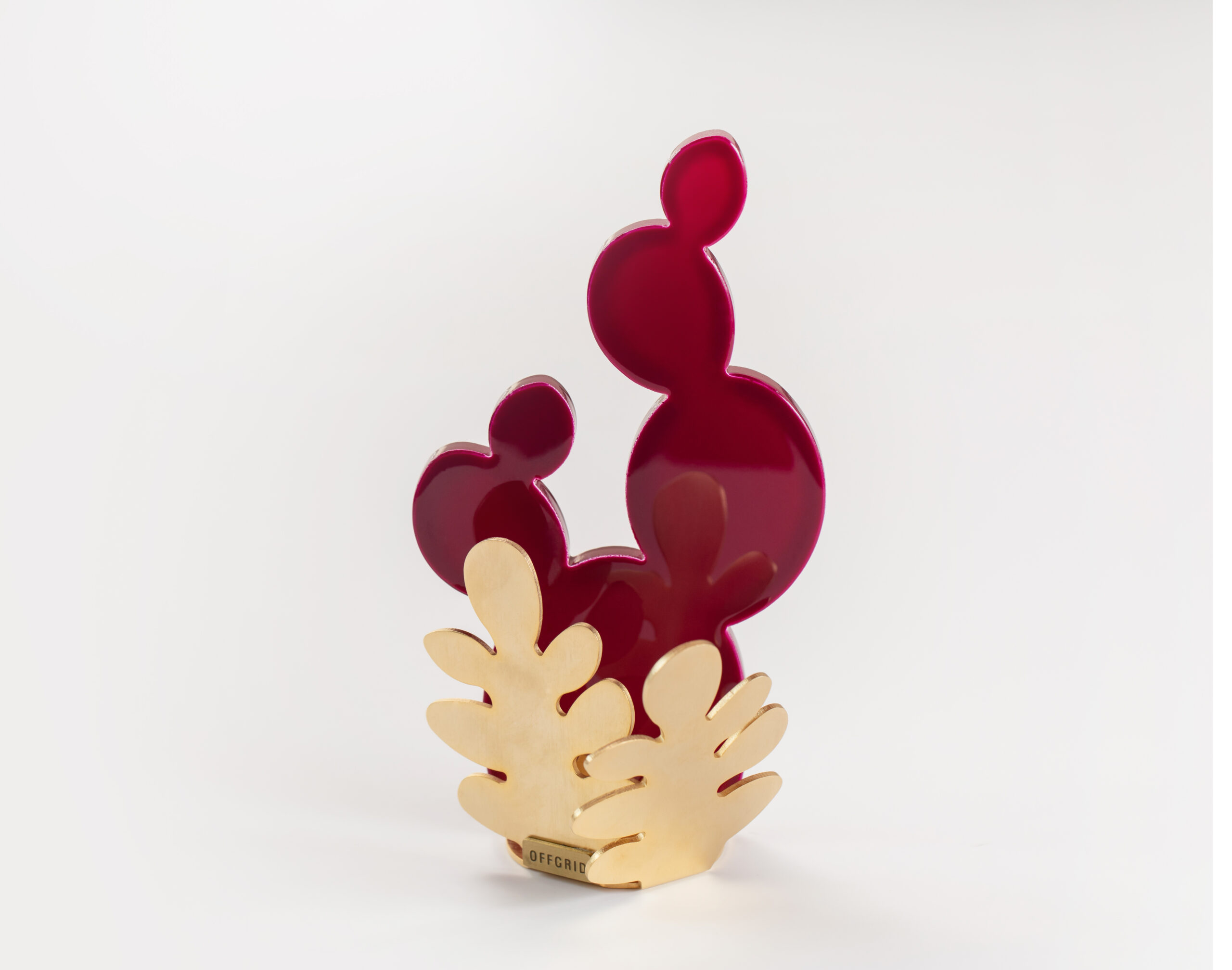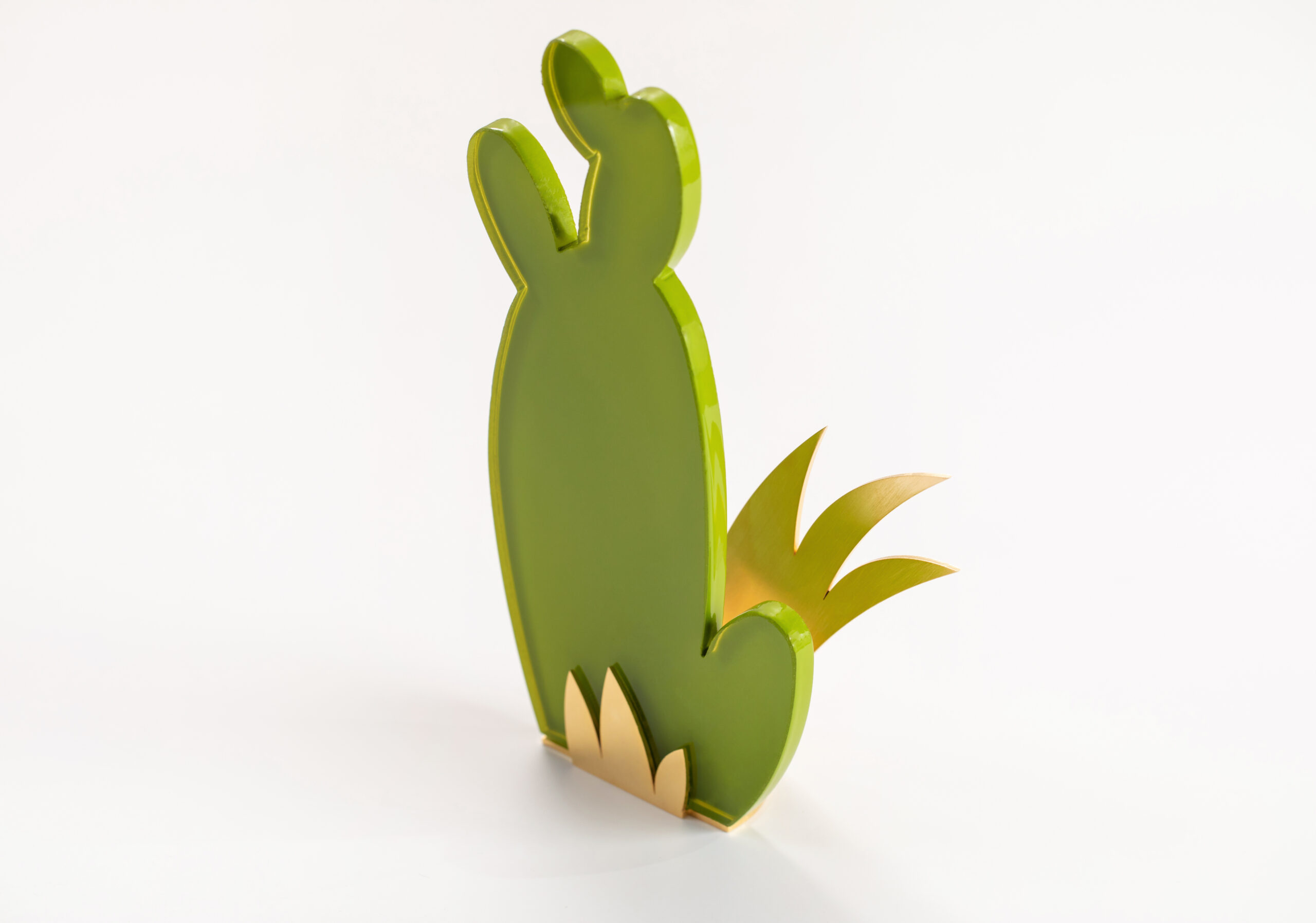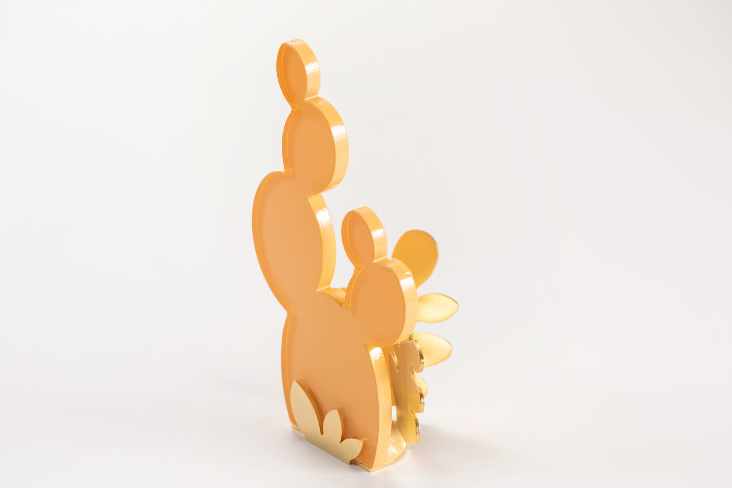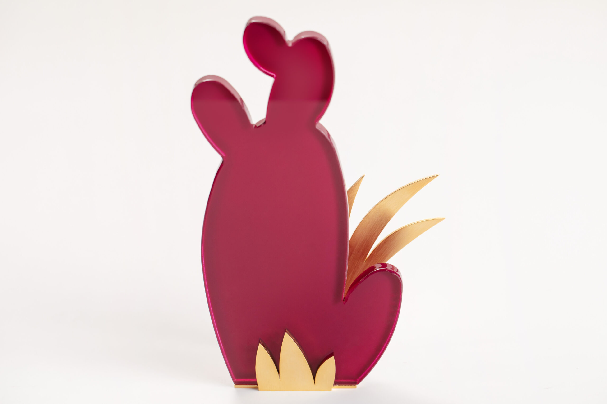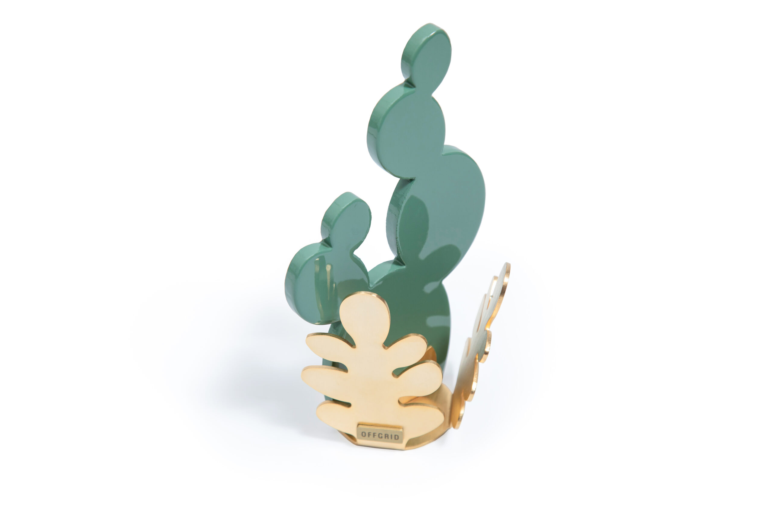 The cactus glass piece sits on a base made from intricately designed brass shaped like a collection of leaves or fronds.
